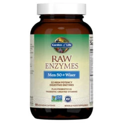 Garden of Life’s RAW Enzymes Men 50 and Wiser is a digestive support supplement formulated specifically for Men 50+. This supplement features 22 powerful digestive enzymes to support digestion, digestive comfort and nutrient uptake. In addition to 22 digestive enzymes this formula also features probiotics as well as vitamins in a vegetarian friendly capsule.