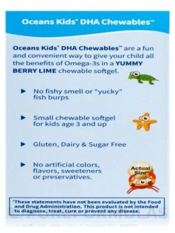 Get your kids to happily take their Omega-3s with Oceans Kids DHA Chewables! These delicious YUMMY BERRY LIME softgels are a fun and convenient way to give your child all the healthy benefits of cod liver oil. With a high ratio of DHA to EPA, these chewables are an excellent source of vital Omega-3 fatty acids. Don’t miss out on this easy and tasty solution for your child’s health!